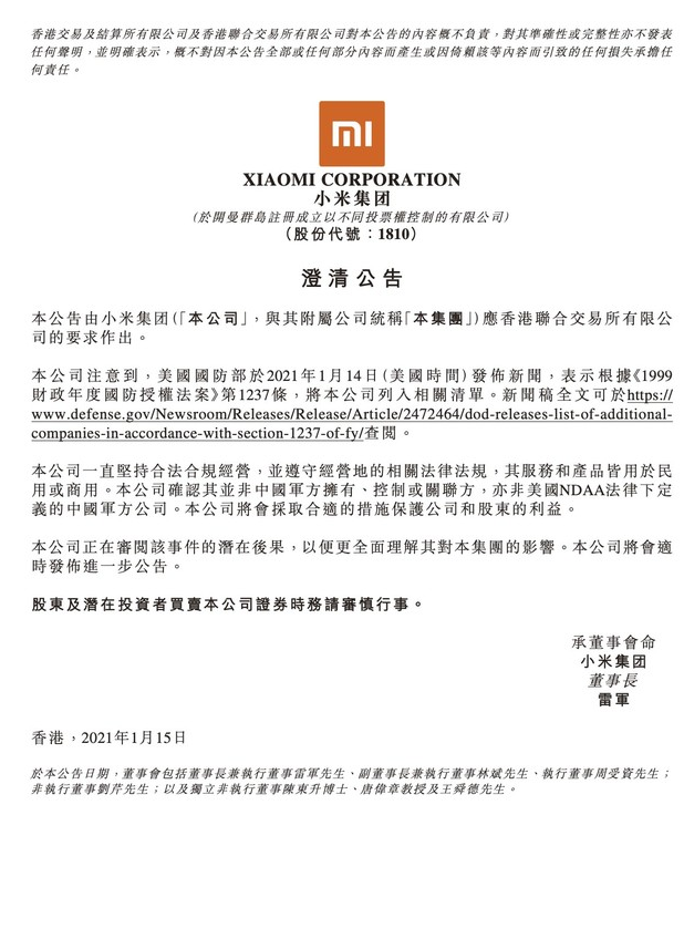 小米就被美方拉黑一事起诉美政府的消息发出后,小米在提交给哥伦比亚特区联邦地区法院的文件中表示,如果上述列名继续存在且限制措施生效,“小米将面临迫在眉睫、严重且无法弥补的损失”。该诉讼还将美防长奥斯汀和财长耶伦列为被告。