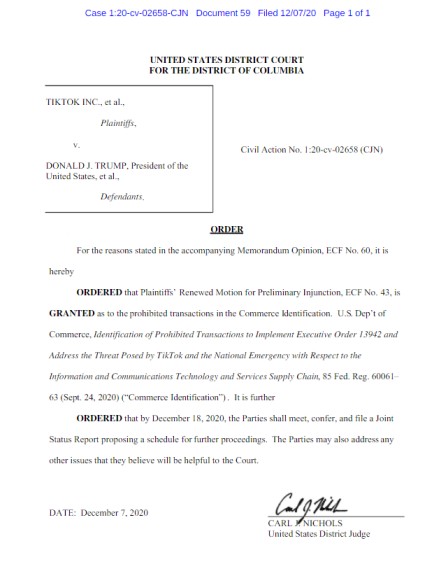 亚汇网实时消息,继宾夕法尼亚州法院法官WndyBtlton阻挡美国总统特朗普政府的限制措施后,华盛顿地方法官CarlNichol也在当地时间周二(12月7日)针对美国商务部颁布命令,阻止其对中国应用视频程序抖音(TikTok)实施限制措施。他表示,美国商务部可能已经逾越其法律职权,且未能考量其他显而易见的替代方案,以武断且反复无