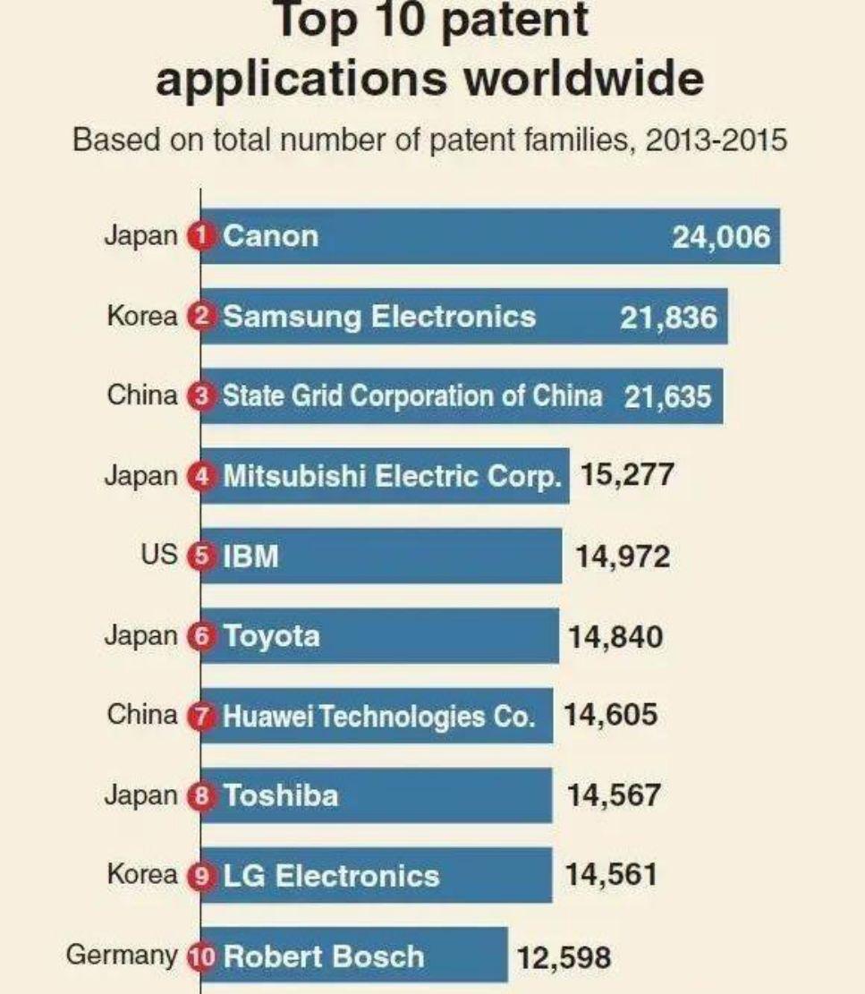 看看专利数量。从2013年到2015年,WIPO(世界知识产权组织)的报告显示,前十中有8家来自中、日、韩国。其中,日本佳能以24006件专利数量夺得第一;其次是三星,专利数量为21836件;第三则是国家电网,专利数量21635件;华为以14605件排名第七。