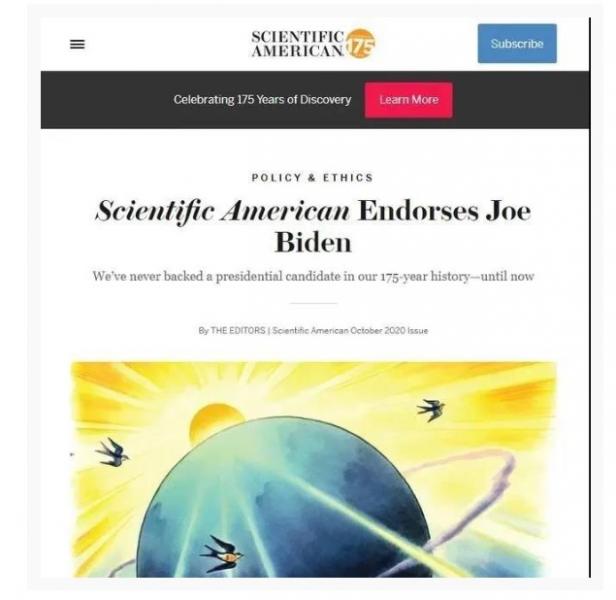 另外一本有着175年历史的《科学美国人》杂志 则在打破传统方面行动得更早。当地时间9月15日,《科学美国人》公开宣布将在今年美国总统选举中“选边站”。这是该刊有史以来首次就美国大选明确表态。 该刊10月号的社论进一步指出,虽然疫情会给所有国家带来压力,但白宫排斥证据和科学,“一直在严重损害美国及美国人民的利益” 。