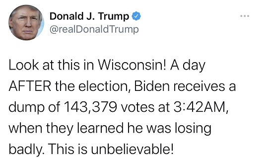 特朗普写道:“看看在威斯康星州!选举的第二天,拜登在得知他输得很惨的时候,在凌晨3:42收到了143379张选票。这令人难以置信!”