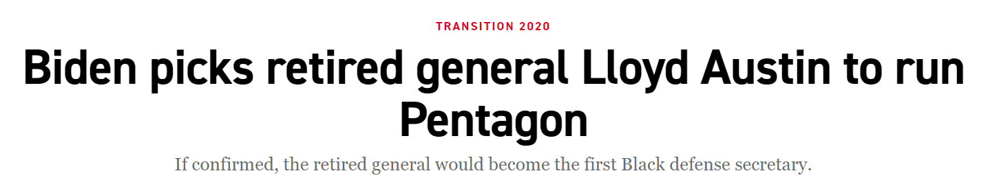 亚汇网实时消息,随着要求提名非裔担任美国国防部长的呼声渐涨,美国olitico报道称民主党总统候选人拜登已经提名退役司令奥斯丁(LloydAutin)为新任美国国防部长,而消息如果得到证实就意味着,奥斯丁将成为领导美国五角大厦的首位非裔国防部长。拜登两周前宣布国家安全高阶团队名单,而奥斯丁被认为是拜登过渡团队所打出