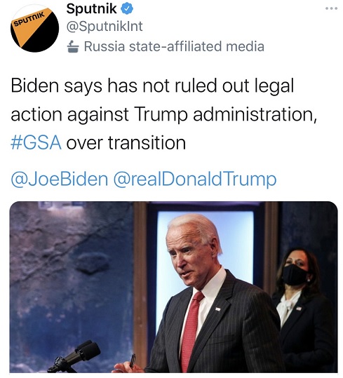 【环球网综合报道】据俄罗斯卫星网消息,美国“当选总统”拜登当地时间19日表示,他不排除对拒不承认其“当选总统”的特朗普政府提起诉讼。 报道称,当天在新闻发布会上,拜登被问及“是否不会排除对现任政府和美国总务管理局(GA)提起诉讼”,而后者应为政权正式交接“开绿灯”。 拜登回答称:“我们不排除这点。”