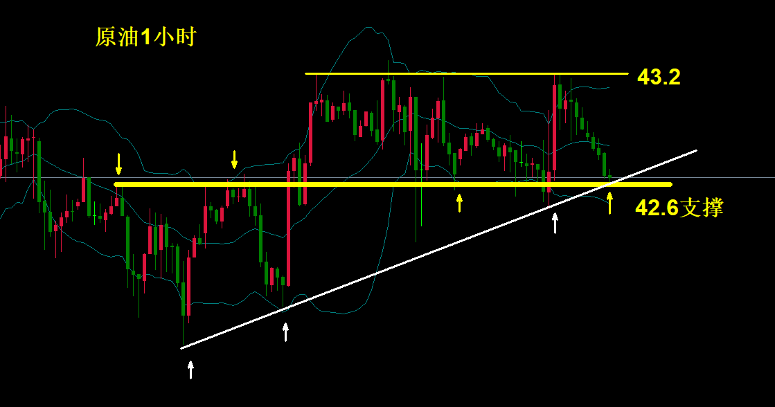 原油目前从一小时图上看,走出了盘整震荡的走势,在类似箱型之间来回震荡,上方的阻力在43.2附近,下方的支撑则在42.6附近。