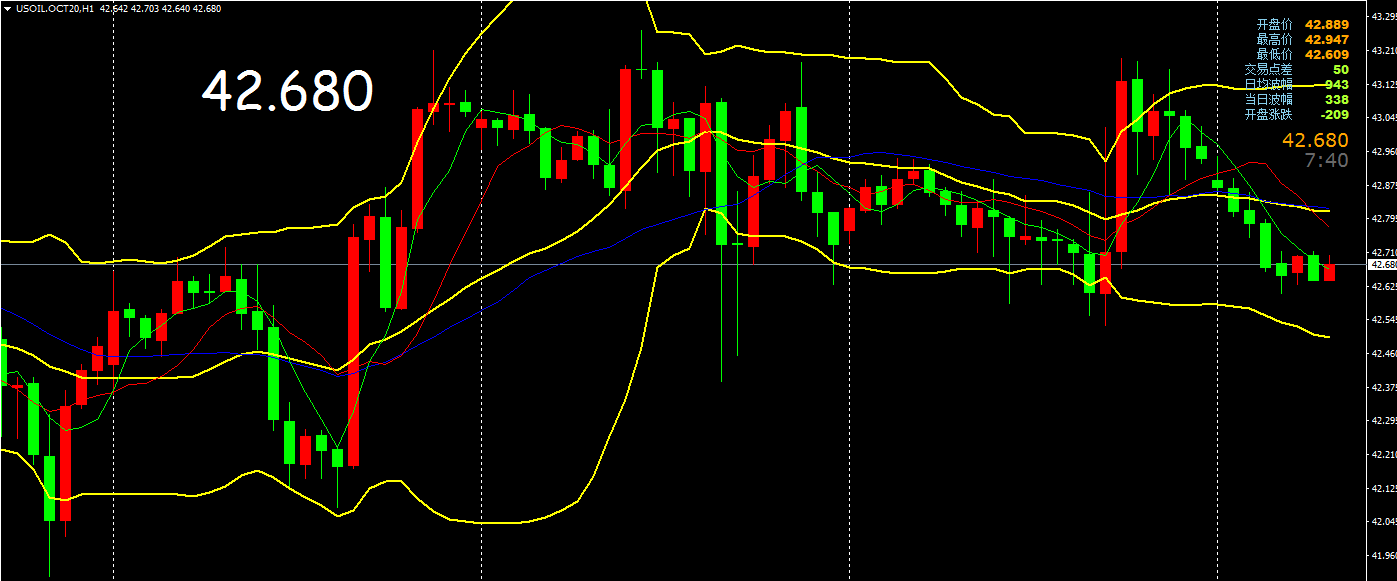 原油昨日整体走势较为鸡肋,全天依托小时线箱体中轨支撑42.5一线窄幅震荡整理,上方最高触及43.2一线再度承压快速回落,全天振幅不到7美金,整体参与空间有限,日线继续以震荡小阳报收,企稳3日均线震荡,目前继续以时间换空间横盘运行,多空均无法彻底突破近期小时线箱体区间,日线上看,布林带微幅朝上运行,MA5均线与MA10均线呈金叉缓和上行,K线交投于布林中上轨间MA5均线附近,MACD快慢线位于零轴上方粘合走平,KDJ三线金叉缓和收口上行,日图行情整体表现震荡偏多形态;4小时图上,布林带三轨趋向走平运行,MA5均线与MA10均线死叉收口趋向走平,K线布林中轨上方MA5/MA10均线附近,MACD快慢线0轴上方初转死叉缓和下行,绿色动能微弱显量,KDJ三线初转死叉运行,油价短线行情震荡,日内操作上建议区间内回落低多为主!