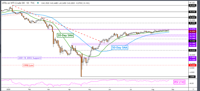原油价格正深入重要的阻力区间42.91-43.87,若后续上破这一阻力区间则更上方的49.42或充当新的阻力;关键的支撑则关注20日和50日简单移动平均线(SMA)。