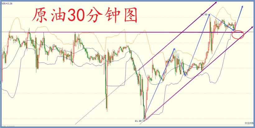 技术面,日线上看,隔日原油位于中上轨继续运行,并依托中轨支撑展开上涨,触及上轨后小幅回落,录得实体中阳,今日原油开盘位于43.3-43.5附近徘徊,涨幅受限,或将探底回升,继续上涨;4小时上看,隔日原油自中轨展开上行,短线刺破上轨后持于高位横盘,当前布林带处于开口期,MA均线三线向上前方,KDJ随机指标到达超买,MACD指标红色动能柱开始缩量,快慢线平行向前,综合来看,原油目前有回落需求,待回落完毕后将会再次上涨,日内操作上现货金油建议回撤做多为主,反弹做空为辅,下方关注42.0-42.5一线支撑,顶部44.5-44.0不破可博弈空单。