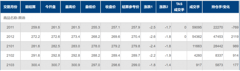 上海原油价格下跌。主力合约2011,以257.1元/桶收盘,下跌2.5元/桶,跌幅0.96%。全部合约成交130568手持仓量增加3567手至114032手。主力合约成交59095手持仓量减少769手至22270手。