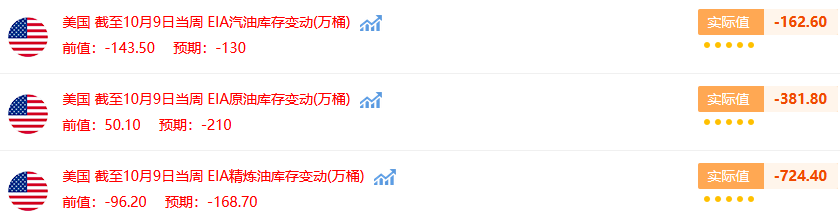 美国EIA公布的数据显示,截至10月9日当周美国除却战略储备的商业原油库存降幅超预期,精炼油库存降幅大超预期,汽油库存降幅超预期。