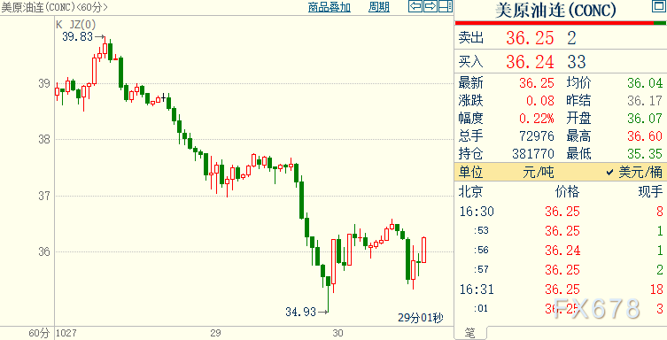 NYMEX原油期货上涨0.17%至36.22美元/桶;ICE布伦特原油期货上浮0.3%至38.31美元/桶。