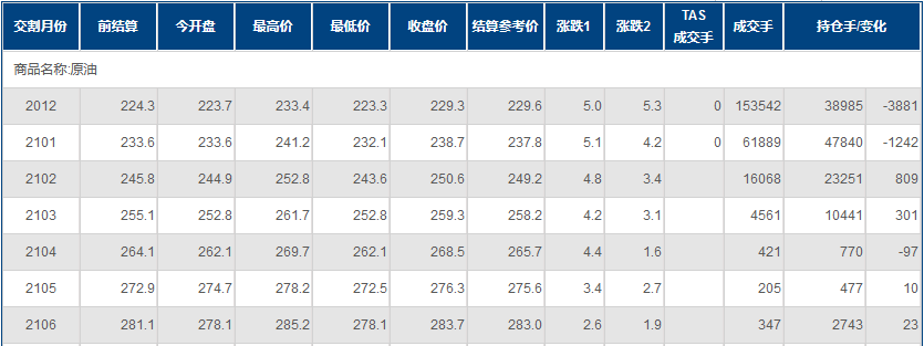 上海原油价格上涨。主力合约2012,以229.3元/桶收盘,上涨5元/桶,涨幅2.23%。全部合约成交237113手持仓量减少4087手至125356手。主力合约成交153542手持仓量减少3881手至38985手。