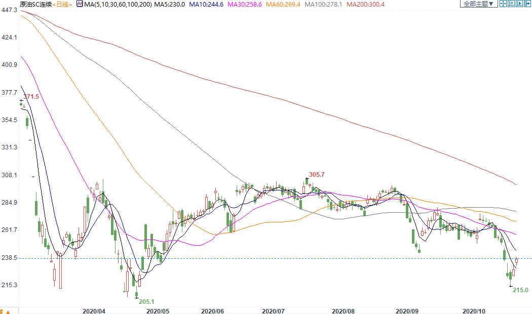 周三(11月4日)上海原油价格上涨。主力合约2012,以238.2元/桶收盘,上涨8.6元/桶,涨幅3.75%。API数据显示美国原油库存意外大幅下降,阿尔及利亚表示,沙特阿拉伯和俄罗斯都在敦促其他成员国将当前的减产协议延长至明年。目前市场对特朗普胜选的预期显著升温,而之前市场预计如果拜登胜选将利空油价,因拜登可能会放松伊朗出口。但分析师们表示,随着美国大选结果保留悬念,市场的不确定性升高。澳洲国民银行(NAB)大宗商品研究和市场部门主管Lachlan Shaw称,“市场最担心的风险情境是不明确的大选结果,考虑到计票情况,大选结果不如早些时候那么明朗,市场正在反映这点”。