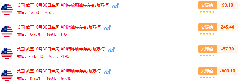 API公布,截至10月30日当周,美国上周原油库存减少800.1万桶;库欣原油库存增加98.1万桶。上周汽油库存增加245.4万桶;上周精炼油库存减少57.7万桶。