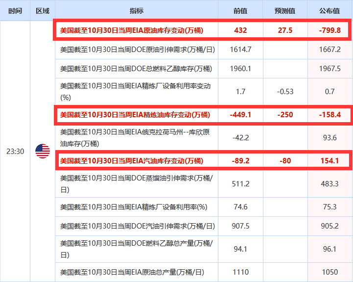 【美国至10月30日当周EIA原油库存-799.8万桶,预期+27.5万桶】