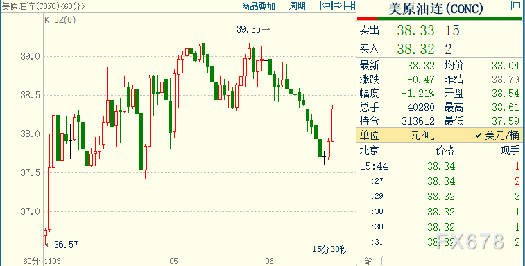 北京时间15:43,NYMEX原油期货下跌1.16%至38.35美元/桶;ICE布伦特原油期货下跌1.03%至40.51美元/桶。
