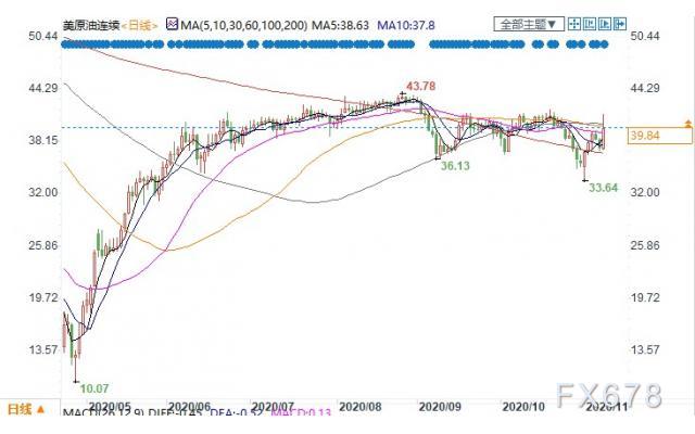 美国WTI 12月原油期货电子盘价格周一(11月9日)收盘上涨2.7美元,涨幅7.27%,报39.84美元/桶。美油周一激飙升逾7%,创下五个多月来最大单日涨幅,此前辉瑞宣布其新冠疫苗取得了令人满意的结果。