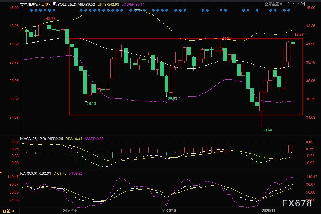 周三(北京时间11月11日)亚盘时间段,美原油冲高回落,一度上涨逾2%触及42.27美元/桶,刷新近两个月内新高,现报41.63美元/桶,较周二结算价涨幅收窄至0.70%;此前美原油连续两日拉升,累计涨幅超过12%,因对新冠疫苗将提振原油需求的乐观情绪,盖过对眼前防疫措施增多可能打击需求的担忧;美国石油协会(API)公布的原油库存降幅大幅高于预期,也给油价提供支撑。但EIA微幅下调2020和2021年的美原油和布伦特油价预测价格,欧美新冠疫情仍在恶化,油价运行至逾两个月宽幅震荡的箱体顶部,需要提防震荡回落的风险。