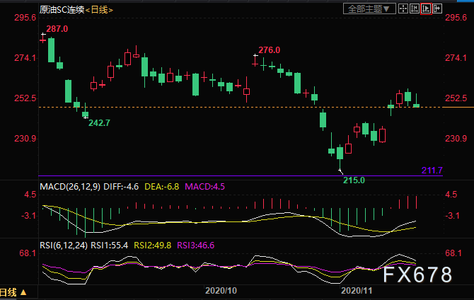 周五(11月13日)上海原油价格下跌,触及三个交易日新低,主力合约2012以248.5元/桶收盘,下跌5.5元/桶,跌幅2.17%。美国新冠确诊病例快速增加使得避险情绪升温,短期经济下行压力较大,而疫苗普及至少在2021年初,且普及过程中不少问题需要解决,油市看空情绪高涨。IEA月报指出,尽管2021年石油需求将增加580万桶/日至9710万桶/日,但仍较2019年疫情发生前水准低300万桶/日;鉴于欧美新冠疫情升温,IEA将2020年全球石油需求预估下修40万桶/日。另外,EIA原油库存意外增加427.7万桶,预期减少87.24万桶,增加幅度大幅高于预期,显示需求可能会进一步减弱,从而压低油价。