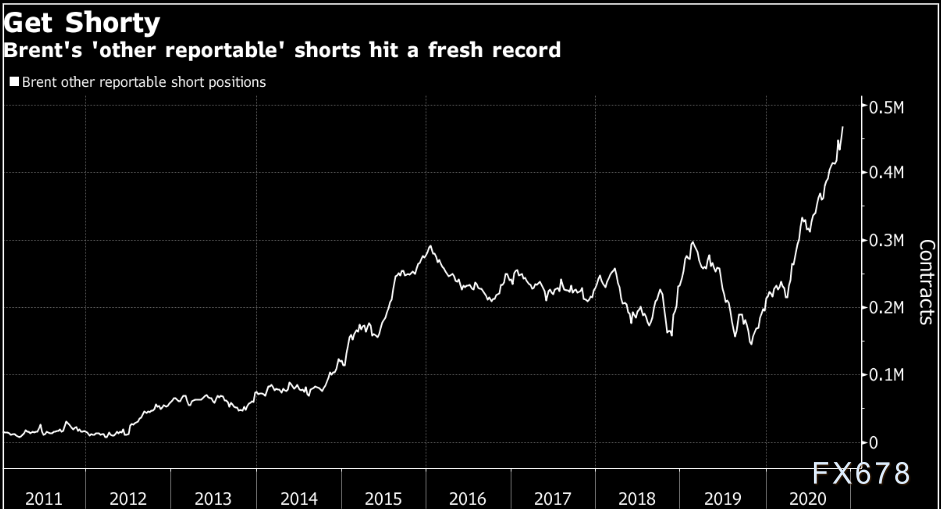 根据ICE欧洲期货交易所的数据,被监管机构和交易所归类为“其他可报告”的交易员目前持有创纪录的近470000张布伦特期货合约空头头寸。这个类别的交易员包括公开信息中查不到其业务活动的实体,或者不适合归入其他主要报告类别的交易商、投机者、生产者或消费者。高频交易员和自营交易行将被包括在内。
