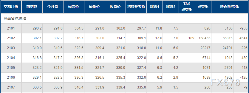 上海原油价格暴涨,主力合约2102终盘收于314.7元/桶,涨12.6元/桶,涨幅4.17%。