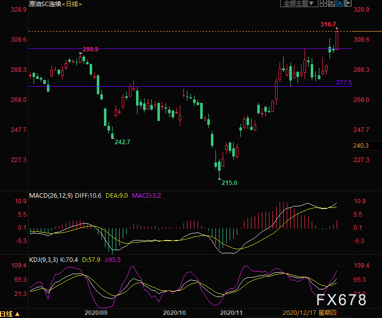 周四(12月17日)上海原油价格暴涨,主力合约2102创3月上旬以来高位至316.7元/桶,终盘收于314.7元/桶,涨12.6元/桶,涨幅4.17%。美油继续刷新九个月新高,逼近关键阻力位50,美国政府数据显示上周原油库存下滑,市场对美国疫情援助方案的乐观情绪也推动油价上涨。此外,美联储利率决议重申低利率政策,美元再创逾两年半新低,英国脱欧谈判也取得进展,也都给油价提供支撑;短线油价有望进一步上涨。