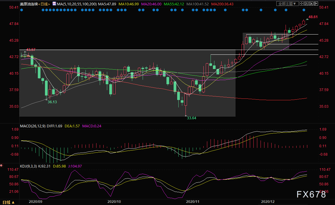 周四(12月18日)美原油上涨逾1%,盘中最高触及48.59美元/桶,为3月3日以来新高,日线也录得四连阳;周线则有望录得七连阳。目前3月3日高点48.66附近还存在一些阻力,一旦顶破该阻力,则有望进一步涨向50整数关口。
