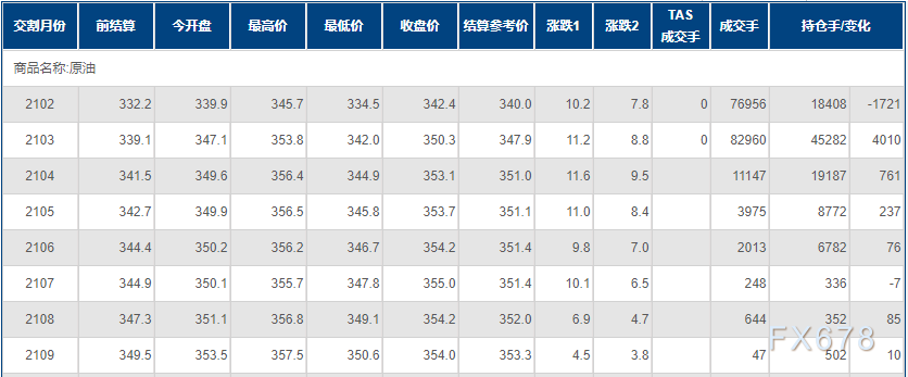 上海原油价格走高,一度刷新十个月高位主力合约2102终盘收于342.4元/桶,涨10.2元/桶,涨幅3.07%。