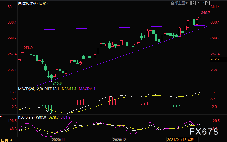 周三(1月13日)上海原油价格大幅走高,一度刷新十个月高位,主力合约2102终盘收于342.4元/桶,涨10.2元/桶,涨幅3.07%。API原油库存的大幅下降给油价提供上涨动能,此前美元走软为已经受到全球供应趋紧的预期提振的市场提供了支撑,原油价格在过去六个交易日中有五天持续上涨冲高,持续上涨时间是5月以来最长,油价走高也得益于沙特阿拉伯上周承诺将在未来几个月削减产量。