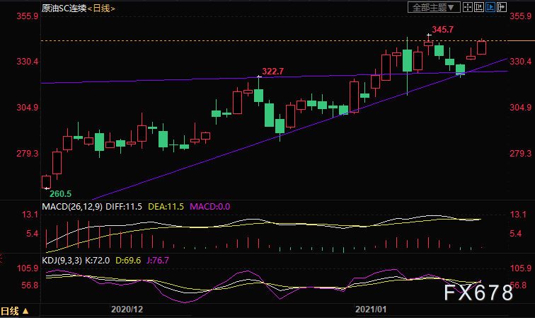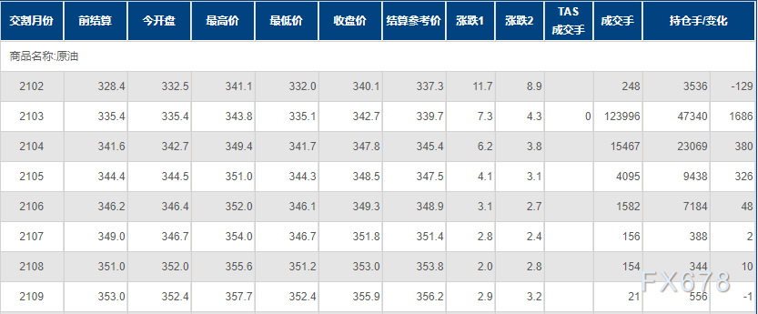 上海原油价格走高,创五个交易日新高,主力合约2103终盘收于342.7元/桶,涨7.3元/桶,涨幅2.18%。