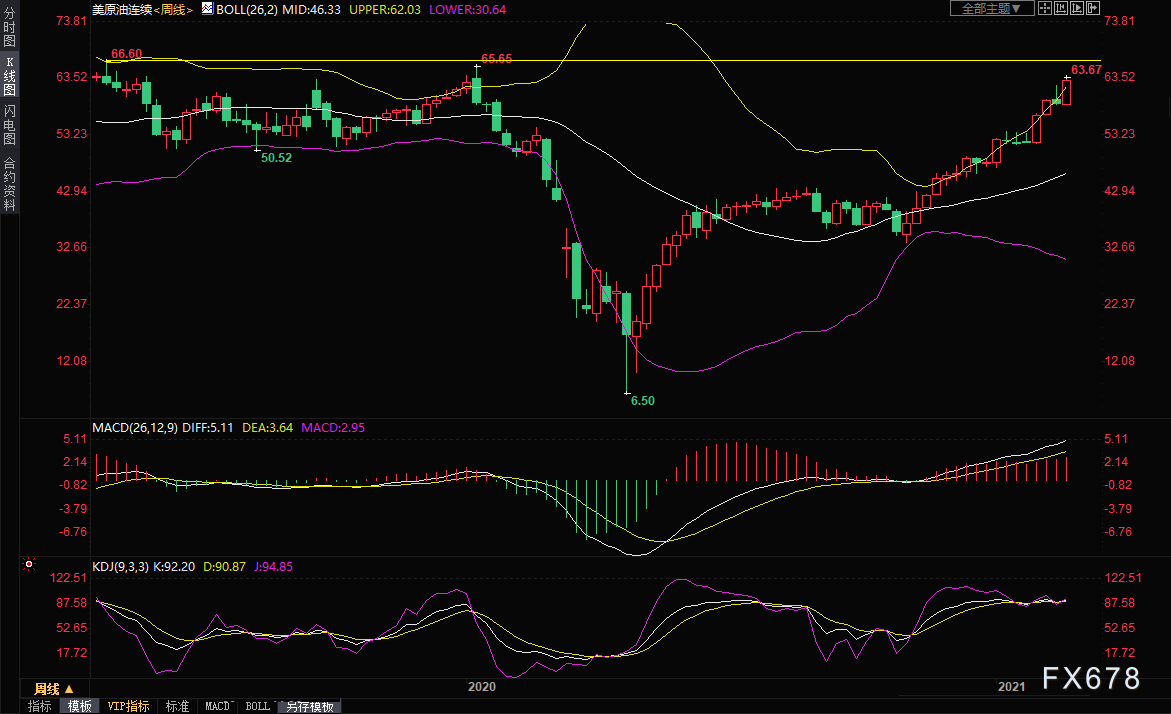 整体来看,K线图显示油价上涨动能仍存,基本面多重利好支撑,在下周OPEC+会议前,市场仍偏向多头,油价存在进一步冲高机会,美原油关注66整数关口附近阻力;但投资者也需要提防OPEC+产油国将讨论从4月起小幅放松石油供应限制的利空影响,可能会引发多头获利了结。