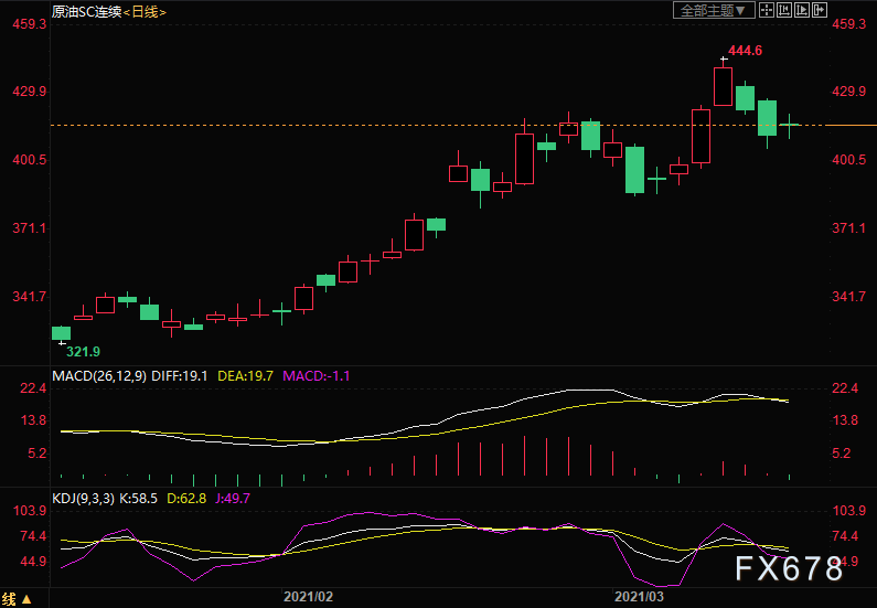 上海原油价格小幅下跌,主力合约2104终盘收于416.2元/桶,跌1.7元/桶,跌幅0.41%。