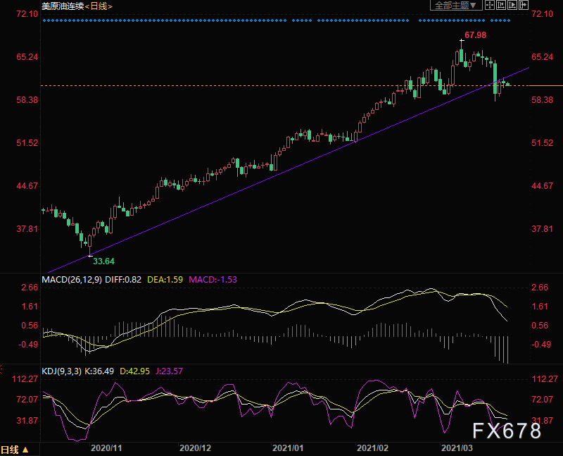 油价继续承压于去年11月以来的趋势线的压力。上周四油价强势跌破趋势线,意味着此前突飞猛进式的上涨基本终结,油价可能陷入暂时低迷。