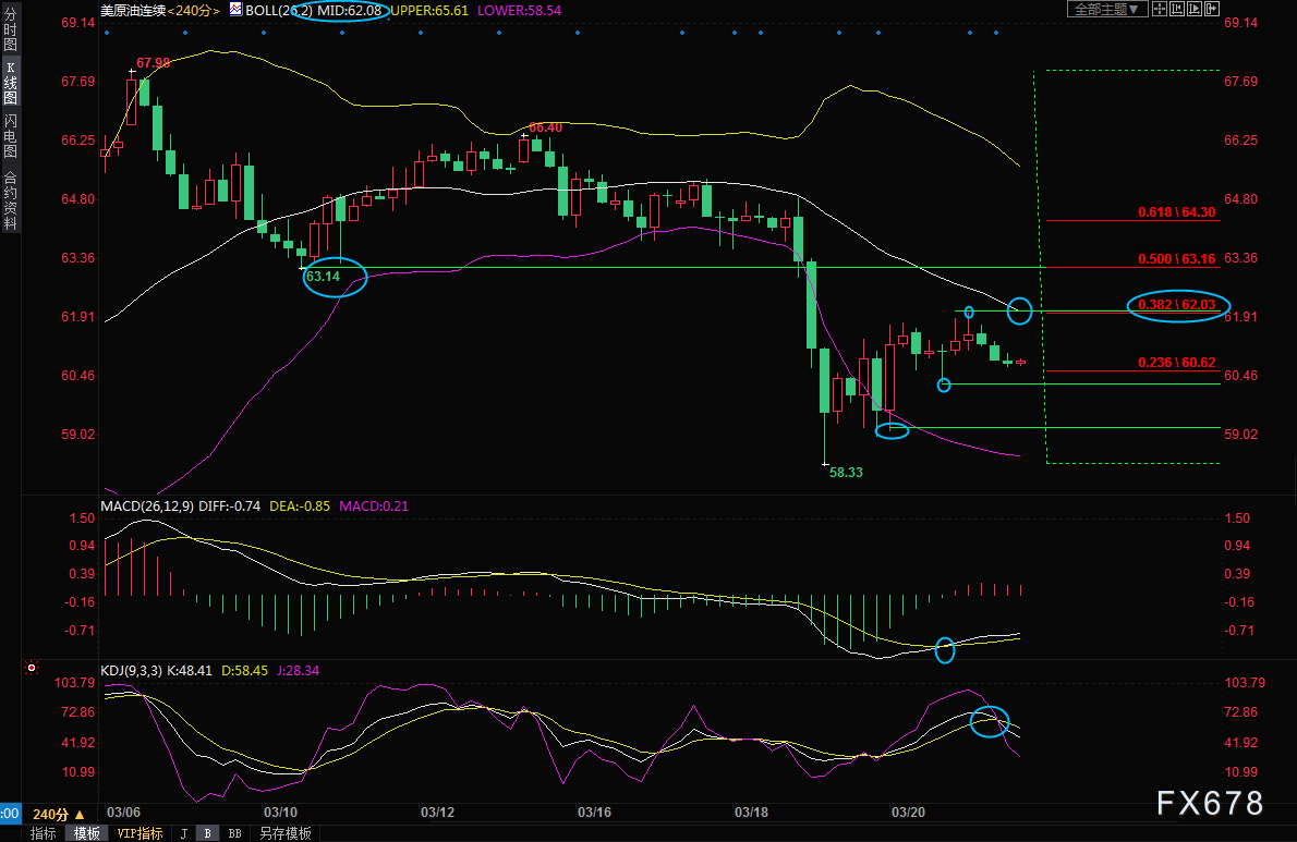上方关注布林线中轨62.08附近阻力,若意外顶破该阻力,则削弱短线看空信号,油价后市可能会进一步试探前期震荡箱体底部63.14附近阻力。