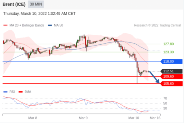布伦特原油 (ICE) (K2) 当日内交易策略: 在 118.00 之下 目标价位为 109.60(20220310)