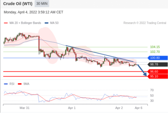 交易策略: 在 100.80 之下,看跌,目标价位为 96.60 ,然后为 95.10 。