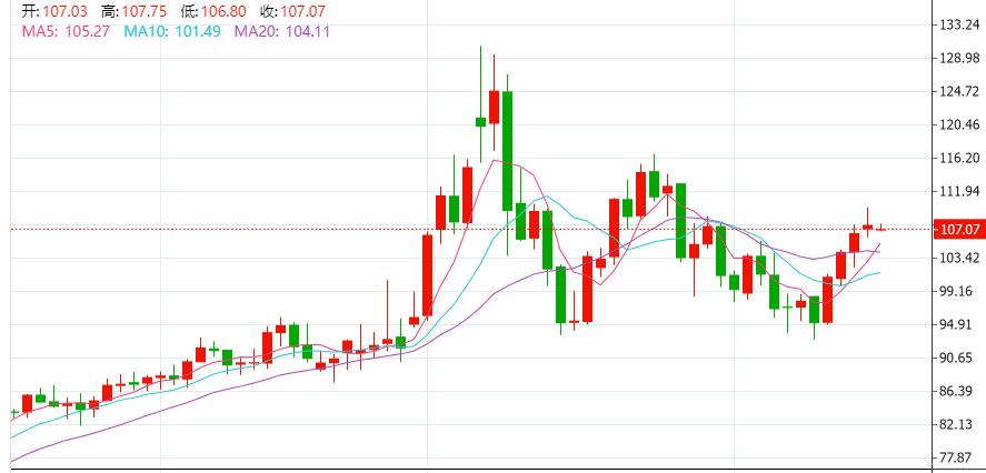 继WTI油价突破下降三角形形态持稳后,若WTI油价突破周一的高点109.13 美元,将依次接近阻力位115.00 美元和125.00 美元整数关。然而,若WTI油价跌破100 均线101.25 美元,将下跌至4 月1 日低点96.94 美元,然后是3 月15 日低点92.37 美元。