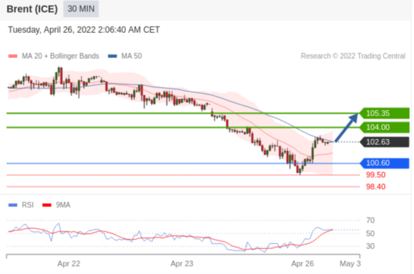 布伦特原油 (ICE) (M2) 当日内交易策略: 在 100.60 之上 目标价位为 104.00(20220426)