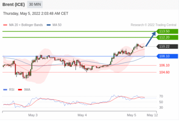 布伦特原油 (ICE) (N2) 当日内交易策略: 在 108.10 之上 目标价位为 112.20(20220505)