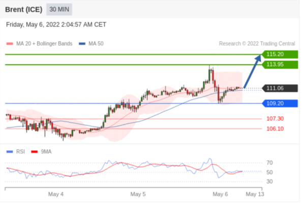 布伦特原油 (ICE) (N2) 当日内交易策略: 在 109.20 之上 目标价位为 113.95(20220506)