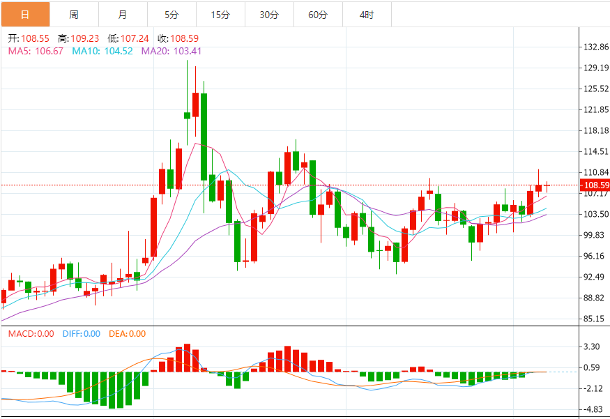 目前上涨将指向110美元,然后最新录得的数日高点110.30美元将考验多头。不过应该注意的是,若升破110.30美元将需要来自114.60-80美元区域短期确认,包括3月以来的多重顶部,这将令原油多头保持警惕。