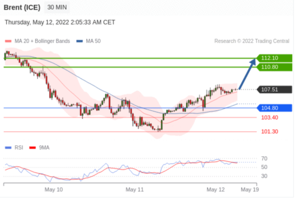 布伦特原油 (ICE) (N2) 当日内交易策略: 在 104.80 之上 目标价位为 110.80(20220512)