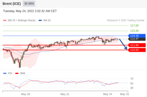 布伦特原油 (ICE) (N2) 当日内交易策略: 在 114.30 之下 目标价位为 111.80 (20220524)