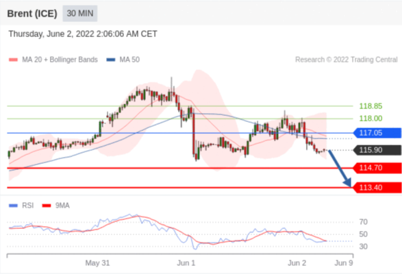 交易策略: 在 117.05 之下,看跌,目标价位为 114.70 ,然后为 113.40 。