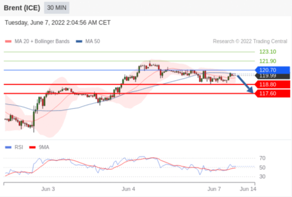 布伦特原油 (ICE) (Q2) 当日内交易策略: 在 120.70 之下 目标价位为 118.80(20220607)