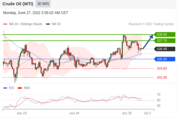 交易策略: 在 105.00 之上,看涨,目标价位为 107.70 ,然后为 108.60 。