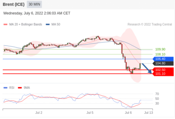 交易策略: 在 106.40 之下,看跌,目标价位为 102.50 ,然后为 101.10 。