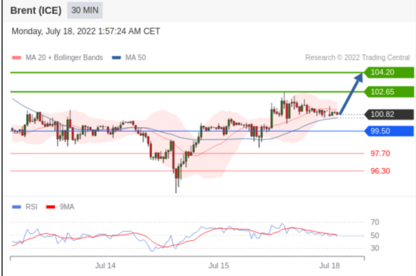 布伦特原油 (ICE) (U2) 当日内交易策略: 在 99.50 之上 目标价位为 102.65 (20220718)