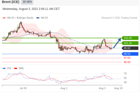 在 98.50 之上,看涨,目标价位为 101.15 ,然后为 102.40 。