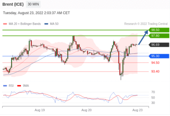 交易策略: 在 95.30 之上,看涨,目标价位为 97.80 ,然后为 98.50 。