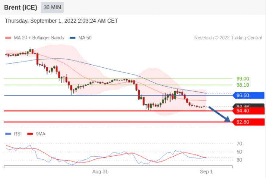 交易策略: 在 96.60 之下,看跌,目标价位为 94.40 ,然后为 92.60 。